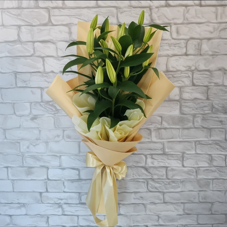 Утонченный и возвышенный букет "Морской бриз" - воплощение изысканности и чувственности. В его композиции изящно сочетаются нежные лилии, расцветающие в белых и кремовых тонах, обрамленные изящными зелеными стеблями. Этот шикарный букет скрыт в элегантной упаковке, создающей изысканное предстательство. Он станет изысканным и запоминающимся подарком для особых моментов и незабываемых встреч.